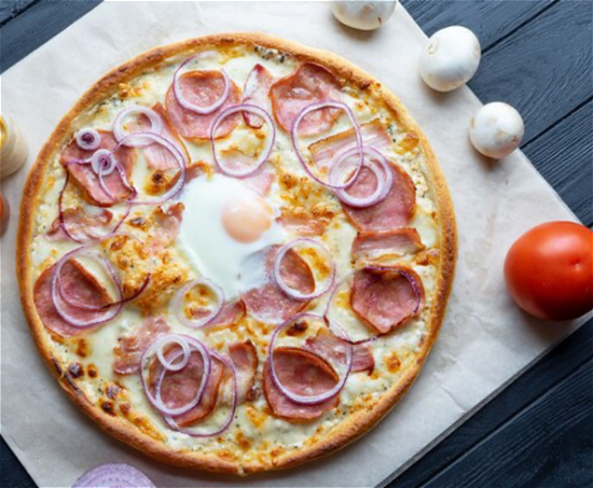 Tomaten saus ,kaas, ham, salami, spek, uien en ei